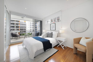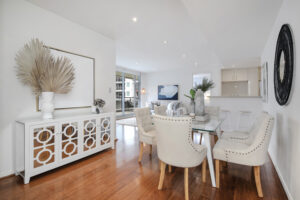 – Large combined living and dining area with floorboards opening onto an east aspect balcony.