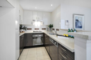 – Modern kitchen features stone bench tops, stainless steel appliances and breakfast bar.